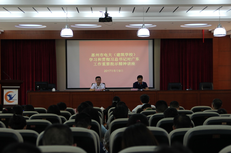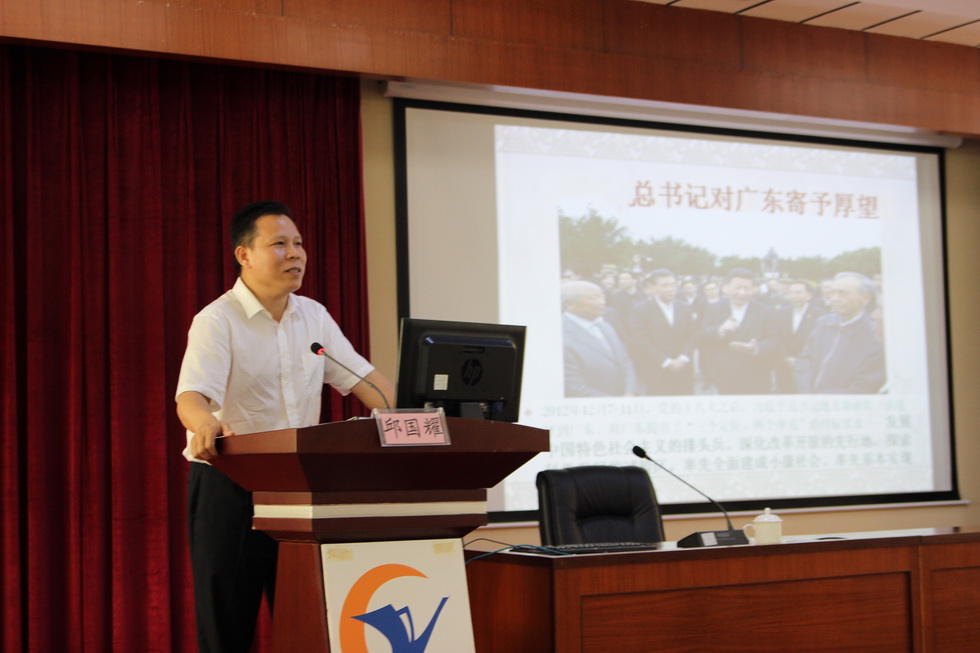 为学习贯彻习近平总书记关于广东工作的重要批示精神,5月9日下午,惠州市电大学习贯彻习近平总书记对广东工作重要批示精神讲座在多功能报告厅举行。报告会邀请了省形势政策宣讲员、市委宣传部讲师团团长邱国耀作专题辅导,全体教职工100多人聆听了讲座。