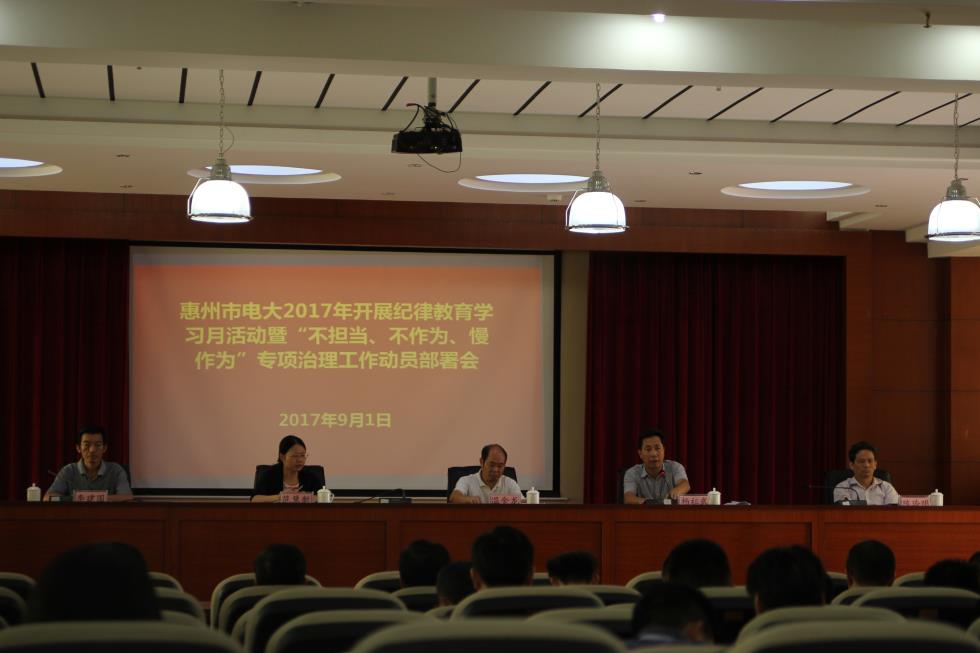 9月1日上午,惠州市电大在多功能报告厅召开2017年纪律教育学习月活动动员大会,对纪律教育学习月以及“不担当不作为慢作为”专项治理进行动员部署,全体教职工参加了会议,会议由杨祖武同志主持。 会上,党委副书记、副校长、纪委书记杨祖武同志传达了《惠州市纪委关于2017年全市开展纪律教育学习月活动的意见》、《市纪委关于开展“不担当不作为慢作为”专项治理工作方案》等文件精神,并就开展纪律教育学习月、“不担当不作为慢作为”专项治理工作的重要意义、教育对象、教育内容以及活动要求等进行了部署。他指出,学校要认真谋划,精心组织,紧扣活动主题,明确活动要求,加强监督,狠抓落实,聚焦“不敢为”、“不会为”、“不想为”、“不担当”的问题,全体教职工要充分认识开展纪律教育月活动的重要意义,切实遵守党纪政纪法纪的自觉性,通过开展专项治理,党性宗旨教育、党规党纪教育、警示和示范教育、党内政治文化和廉洁文化教育,确保纪律教育学习月活动取得实效。 学校党委书记、校长温金龙同志就开展纪律教育学习月活动作动员讲话。他要求全体教工要充分认识开展纪律教育月活动的重要性和必要性,把纪律教育作为学校的重点工作来抓,做到“三个结合”:把纪律教育月活动与学校的办学目标相结合起来,与党的纪律教育、万众评公务、政风行风建设相结合起来,与师德师风建设活动工作相结合起来,做到“执行纪律无条件、遵守规矩不含糊、守住底线不逾越、遇到红线不触碰”,从而促进全体教职工实现五个明显:锐意进取、奋发图强,精神面貌明显改观;敢于负责、勇于担当,工作作风明显改进;心系发展、执政为民,服务意识明显增强;求真务实、真抓实干,执行力明显提高;办事便捷、服务高效,教书育人环境明显优化。实现学校队伍建设方面的“三个提升”:在教师政治素质和师德素养上有新的提升,在服务学生与树立形象上有新的提升,在推进学校各项工作和教育教学质量上有新的提升,最终推进学校顺利转型发展。