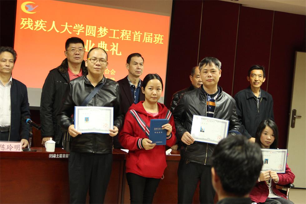 12月16日,惠州电大在综合楼801室举行残疾人大学圆梦工程首届班毕业典礼。市残联党组书记、理事长曾建廷,副理事长魏刚,惠州电大党委书记、校长温金龙,副校长陈玲明、李建国出席典礼,20名残疾人或残疾人工作者拿到大专文凭,圆了大学梦。