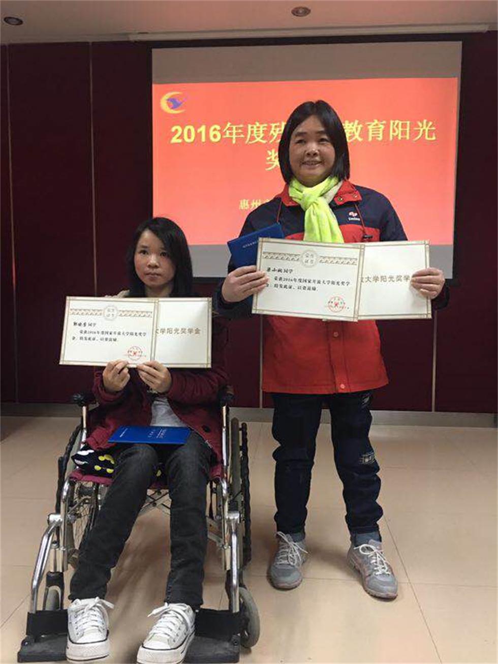 典礼还为两名国家开放大学残疾人教育阳光奖学金获得者颁发了证书。国家开放大学残疾人教育阳光奖学金阳光奖学金获得者梁小娴作为毕业生代表做了发言,她向同学们讲述了她个人在求学过程中坚持不懈、克服各种不便因素的经历,展现了自强不息、勤奋好学的品质。