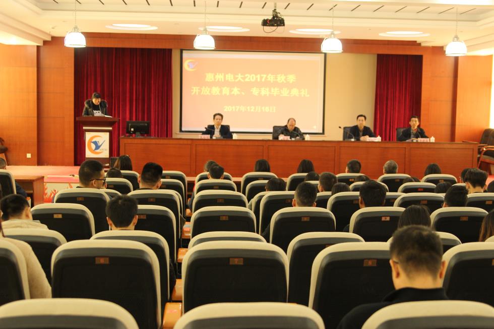 12月16日上午,惠州市广播电视大学在综合楼12楼报告厅举行2017年秋季开放教育本专科毕业典礼。学校领导、各班班主任和2017年春本专科毕业生出席了典礼,典礼由学校李建国副校长主持。