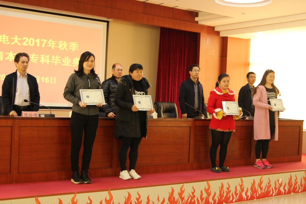典礼上,学校领导为2017年秋季本、专科学生代表颁发了毕业证书。在热烈的掌声和真挚的祝福声中,惠州电大2017年秋季开放教育本专科毕业典礼圆满结束。