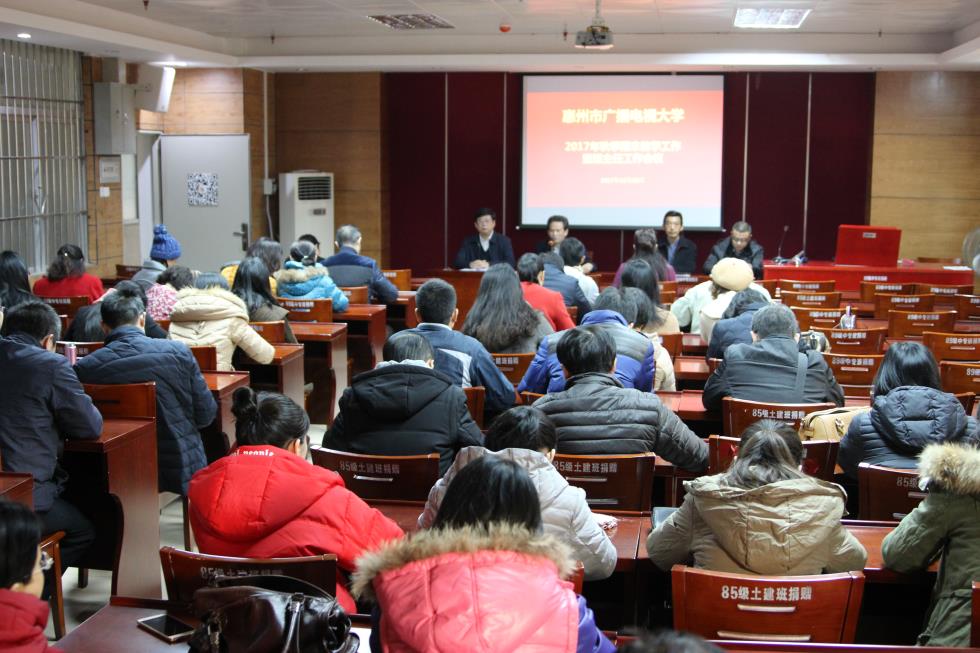 12月18日下午,惠州电大2017秋开放教育期末教学工作会议在综合楼802召开。副校长李建国、陈玲明出席会议,附属中职主管教学副校长、教务科相关负责人及开放教育全体班主任、任课教师参加了会议。会议由附属中职副校长周坚主持。
