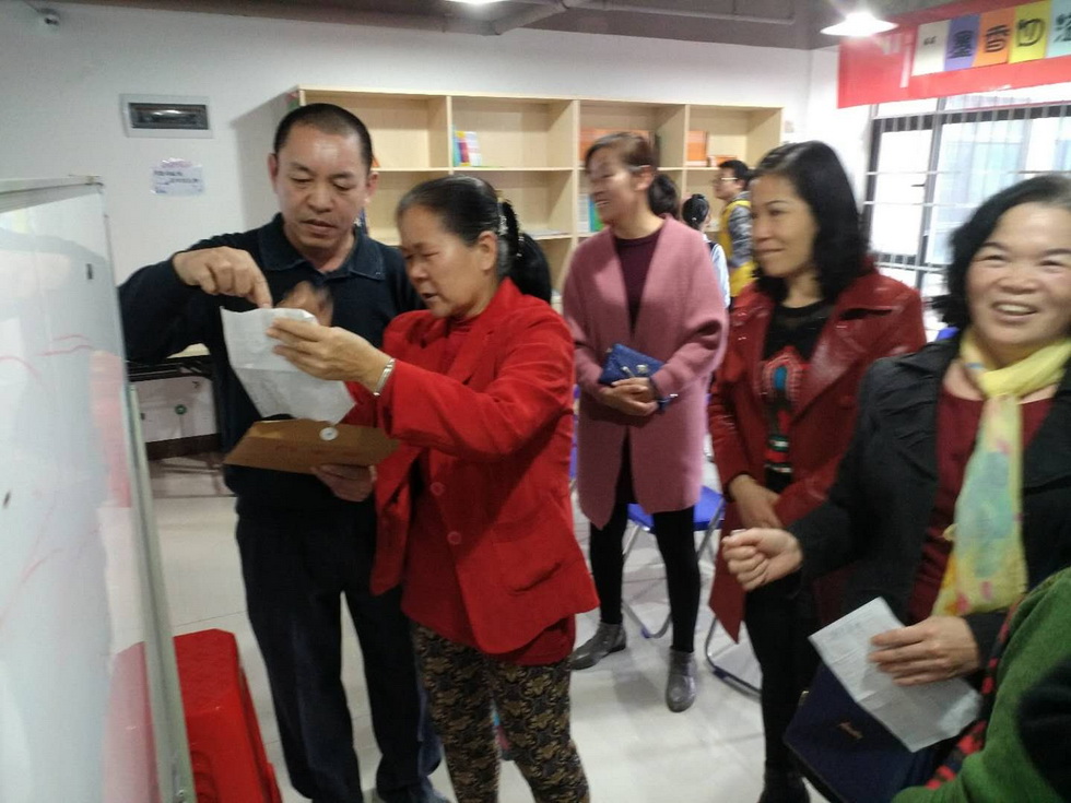 在讲座结束后,陈挺刚老师现场挥毫,书写春联送给金湖社区的居民。陈挺刚用笔雄浑有力,现场的市民对其书法啧啧称赞。活动原本计划进行至5点,但因群众热情洋溢,纷纷请求延长活动时间,主办方于是决定延长半个小时。