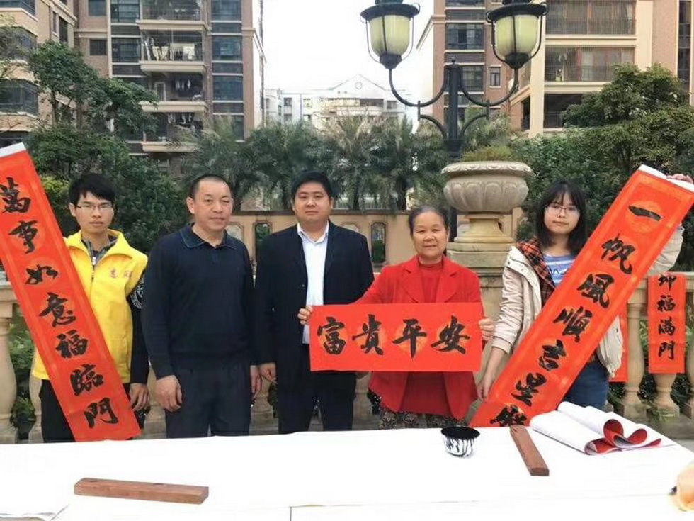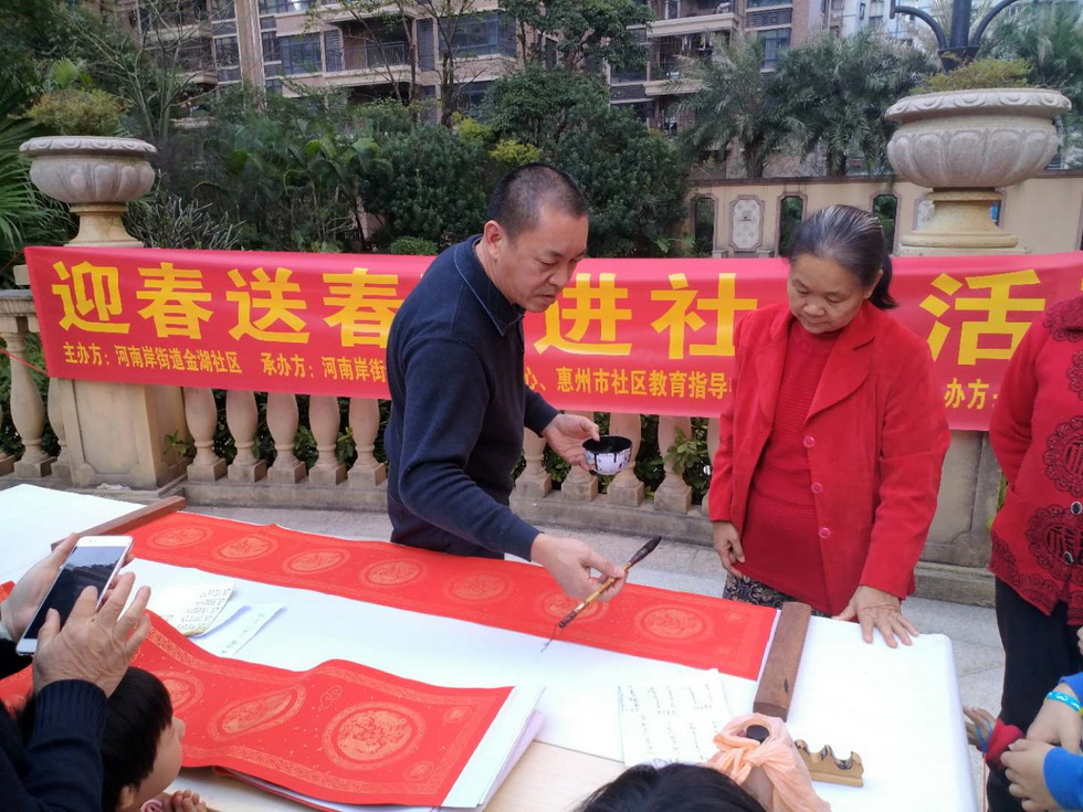 1月17日下午,惠州市广播电视大学、惠州市教育指导服务中心联合惠集读书社走进金湖社区以及河南岸街道居家养老服务中心,举办“墨香四溢”书法讲座暨送春联活动。