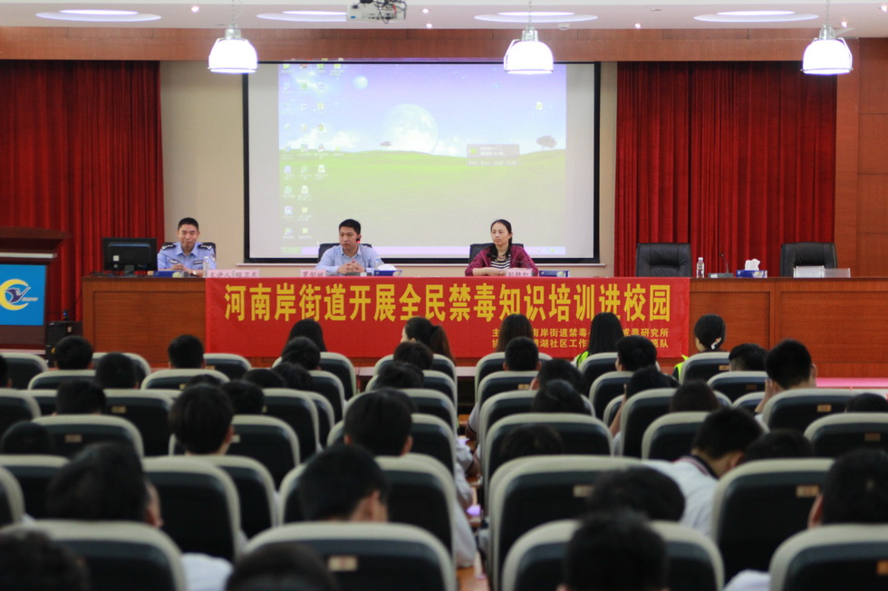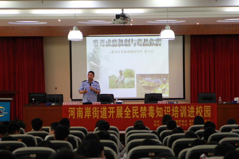 进一步加强校园禁毒宣传教育力度,提高在校师生防毒、拒毒、识毒意识和能力,4月24日下午, 河南岸街道禁毒办联合其缘戒毒研究所、南雁禁毒志愿服务队在惠州市电大综合楼多功能报告厅举行“全民禁毒知识培训进校园”活动,200多名学生参加了此次活动。
