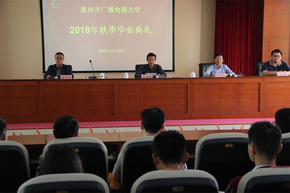 11月24日上午,惠州电大在12楼多功能报告厅举行2018年秋季开放教育毕业典礼。副校长李建国、相关科室负责人、各班班主任及167名本专科开放教育毕业生参加典礼。