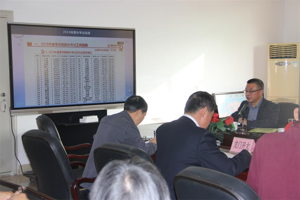 教务科负责人彭征宇在会上传达了国家开放大学考试工作会议精神;并结合我市实际,就如何进一步组织完成好开放教育期末考试各项任务提出了具体落实意见。一是充分认识此次期末考试的重要性;二是各电大都要制定期末考试工作方案,全面布置考试工作;三是全面梳理考试环节,查堵考试安全隐患;四是落实工作人员培训;五是加强网上监督,加强防范监控;六是规范实施考试,做好应急预案。七是坚持规范管理落实细节。八是坚决杜绝泄密事故和违法考试行为,圆满完成本次考试任务。