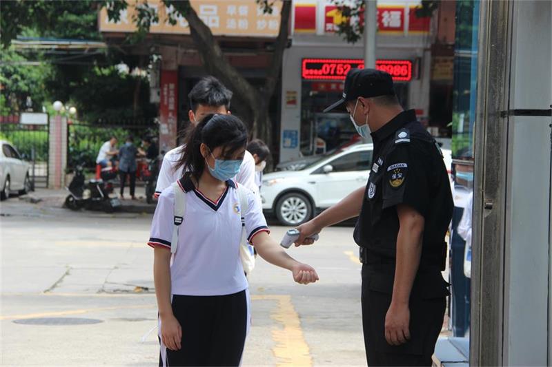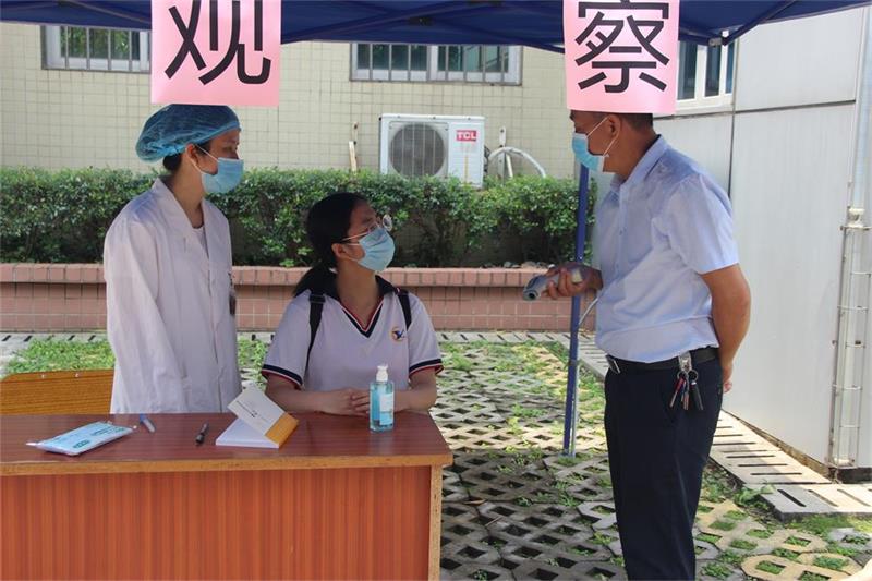 本次演练模拟了师生进校、上下课、课室出现异常情况等场景。学校大门是校园疫情防控的第一道防线,把好校园第一道关卡至关重要。校门口设有检测通道,学生按前后间隔一米以上排好队,由值班教师测量体温,体温正常并佩戴好口罩方可入校。入校演练过后,紧接着预演了入校时出现体温异常学生的情况,并模拟了将体温异常学生转入临时隔离观察室、进入应急处置程序的场景。随后,在课室出现异常情况的场景模拟演练中,任课老师首先将体温异常学生情况向班主任报告,班主任向家长了解情况后,实行层层上报制度,同时将体温异常学生转入隔离观察室,其余学生有序疏散,并由专业人员对学生所在课室进行消杀。整个演练过程中,各岗位工作人员依照疫情处置程序规范操作,分工明确、反应迅速、操作规范、协调有序,达到了演练的预期目的。