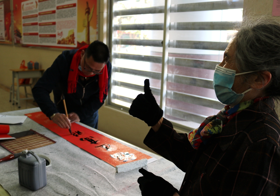 活动现场,工作人员耐心引导群众排队领号,细心帮助挑选春联内容。现场群众有的耐心排队等候书法家书写,有的等待纸张墨水干透,大家相互交流沟通。“万象更新迎百福,一帆风顺纳千祥”、“国泰民安逢盛世, 春满人间喜气盈”……在喜庆的话语中,在改造一新桂花飘香的小广场上,现场参加的群众笑容满溢,气氛热烈。本次活动共送出春联400余副。