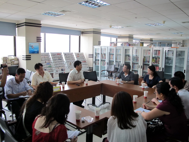 学习考察组在参观中央电大图书馆过程中,张瑞麟馆长、曹钢副馆长还专门腾出时间与我校学习考察组人员举行了座谈,张馆长介绍了中央电大图书馆目前的情况和发展计划,他表示中央电大已规划了1000多万元专款用于图书馆建设,下来待中央电大搬迁到位于五棵松的新校址后,图书馆的面积将扩大四倍左右,不但要增加藏书量,还要在全国电大系统建立电子图书网络,实现全国电大系统图书资源共享。吴汉朋校长重点介绍了我校图书馆建设工作,他说学校现任班子高度重视图书馆建设工作,在下半年即将投入使用的新教学大楼规划了两层楼建设图书馆和电子阅览室等,还介绍了我校近期开展的捐书活动以及师生、社会力量踊跃捐书的情况。听了吴校长的介绍,张馆长、曹副馆长非常高兴,高度评价我校重视和积极推进图书馆建设的举措,认为这与中央电大加强图书馆建设的工作不谋而合,并表示在中央电大扩建电子图书网络中,可以与我校加强合作,考虑将我校确立为电子图书网络扩建的市级电大试点单位,尽快将中央电大的电子图书网络延伸到各基层电大,让全国电大师生共享共用,促进电大的教育教学工作。