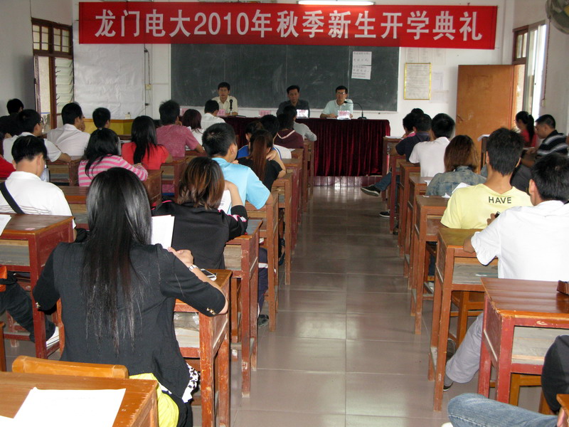 2010年10月9日和10日,龙门电大分别举行了简朴而隆重的2010年秋季专科、本科新生开学典礼。 200多名新同学参加了典礼,龙门电大副校长刘德普、甘锦才,教务处主任茹子锋、新生班班主任出席了典礼,典礼由甘锦才副校长主持。