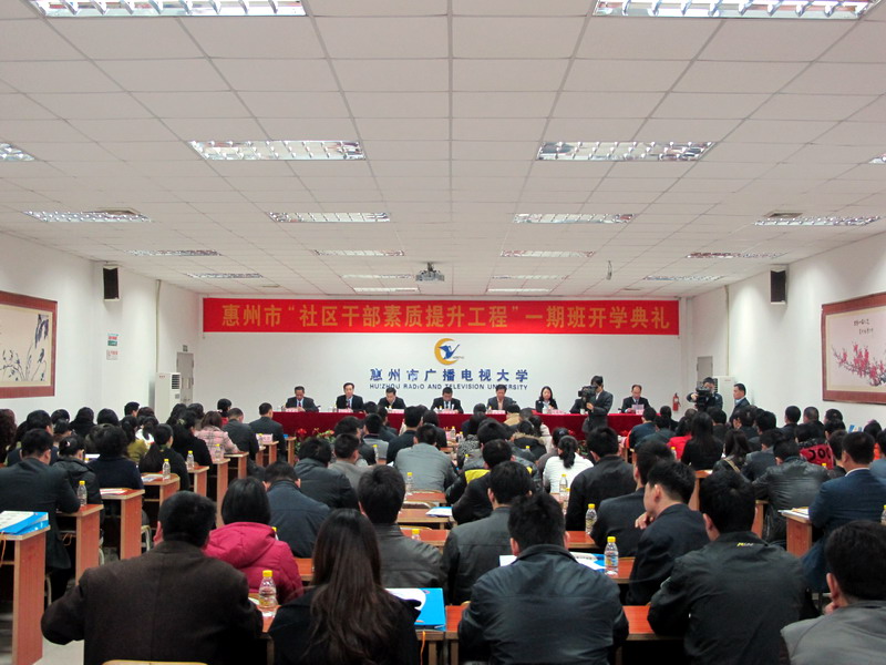 惠州市“社区干部素质提升工程”一期班开学典礼,标志着由市委组织部、市广播电视大学联合实施的“社区干部素质提升工程”正式启动。“社区干部素质提升工程”采取“组织部门牵头、电视大学主办、远程授课为主、各级分担学费”教育模式,计划每年招录一批社区干部大学生(其中专科层次约200名、本科层次约50),3年内共培养750名,力争到2013年社区干部大专以上学历占50%以上的目标。学习教育经费由市财政、县(区)财政、乡镇(街道)、市或县(区)电大各分担30%、30%、20%、10%,个人分担10%。此“工程”是一项组织上、经费上、教学管理上有保障的惠民工程,是我市提高社区基层干部综合素质、大量培养社区党组织带头人和后备力量的重要渠道。是加强和创新社会管理,建设学习型社会,推进社区工作的有效载体,创全省社区干部培训教育先河。