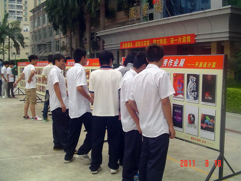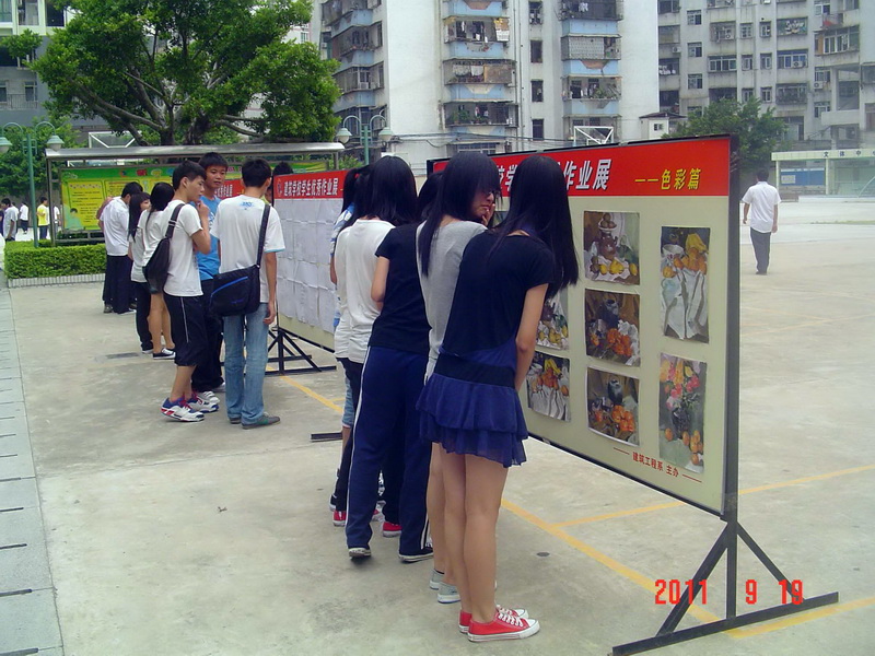 此次展览以喷绘和张贴相结合的方式进行,展出科目覆盖面广,涉及到的专业课程较为齐全,包含了色彩、素描、3DMAX、平面设计CorelDRAW、图像处理PhotoShop、建筑装饰表现技法和建筑工程制图,较完整地展示了建筑专业实训的成果。