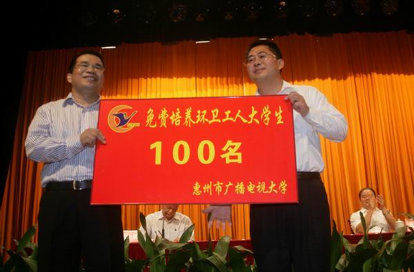 为进一步提高惠州市环卫工作者综合素质,巩固全国文明城市成果,促进“幸福惠州”、“惠民之州”的建设,市广播电视大学将和市环卫局联合起来,免费培养“百名环卫工人大学生”。