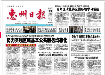 “省党代会报告提出,没有文化支撑和精神富足,就没有真正意义上的幸福广东;加快完善公共文化服务体系,广泛开展全民健身活动。”省党代表、来自仲恺高新区陈江街道东升村的宏军挺在本次省党代会上关注的是农村文化设施建设问题。他建议加强对农村文体卫生设施规划建设的力度,让农村群众过上文明健康快乐的生活。惠州日报5月13日对此进行了报道。
