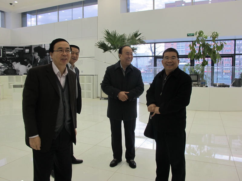 【图为国家教育咨询委员会委员、中组部原秘书长高世琦(右二)、国家开放大学(中央电大)党委副书记张少刚(左一)、吴校长等与会领导在国家开放大学展厅参观、交谈】