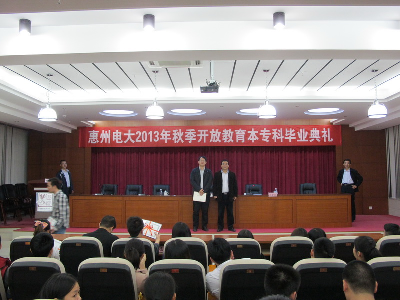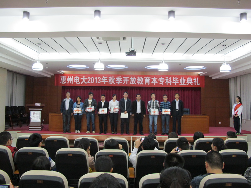 典礼上,学校领导为中央电大优秀毕业生高迪颁发了荣誉证书,为2013年秋季本、专科学生代表颁发了毕业证书。在热烈的掌声和真挚的祝福声中,惠州电大2013年秋季开放教育本专科毕业典礼圆满结束。