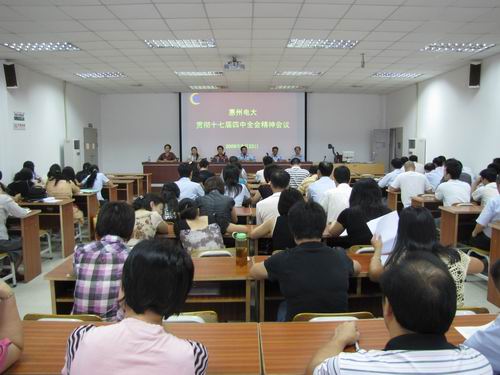 结合学校实际,吴校长提出四点贯彻意见。一是认真组织好学习。要求全体教职工尤其是党员干部深入学习党的十七届四中全会精神,以此促进自身学习、工作水平的不断提高。各部门要把学习贯彻党的十七届四中全会精神作为当前和今后一段时期的一项重要政治任务,切实抓紧抓好,取得实实在在的效果。二是认真抓好党建工作。加强学习型党组织的建设;加强领导班子、中层干部以及教师队伍的建设;加强民主集中制的建设。三是大力推进党风廉政建设。四是认真抓好各项日常工作。包括:惠州市“培养村官大学生工程”首期学员班开班典礼;国庆中秋期间安全维稳工作;新大楼的建设和资金筹措工作;系部科学运作工作;学生管理特别是新生入学教育;秋季招生收尾工作;制度建设;防治甲流等八项工作。