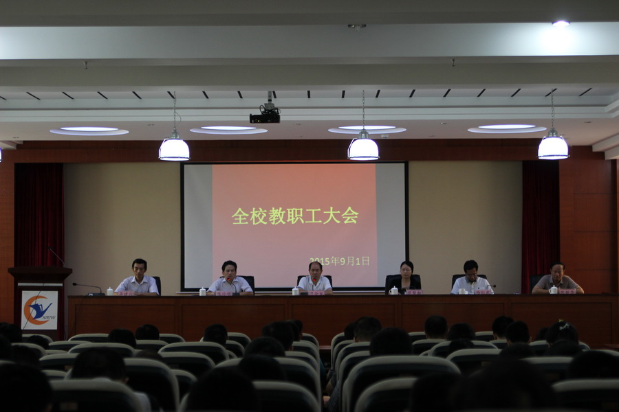 惠州电大党委书记、校长温金龙主持会议并作重要讲话。他通报了暑假期间学校的招生等工作情况,并指出,面对招生新形势、新挑战,全体教职工要强化责任意识,转变工作作风,团结协力,紧紧围绕“保安全、优服务,建规范、打基础,提质量、增效益”的工作主线,做好新学期及今后的工作:“保安全”就是要强化学生安全教育,注重安全管理细节,落实全员安全“一岗双责”,确保学校和谐平安。“优服务”就是要树立良好服务意识,优化细化服务,不断提升服务水平,以优服务提升竞争力和吸引力。“建规范”就是要建章立制,建立完善行政管理、学生管理、后勤管理等有关制度,形成长效机制并抓好落实。“打基础”就是打牢办学基础,硬件着重完善设施设备;软件着重提升教育信息化水平,着重提升教育教学管理能力,着重提升教师的教学能力和教学水平。“提质量”就是要切实转变教育观念,注重学生人文素养、职业素养和品德教育,强化教学管理,推进教学改革,从而提高人才培养质量。“增效益”就是要克服办学困难,降低运作成本,提高工作效率和服务质量,争取更好的效益,进一步推动学校顺利转型发展。