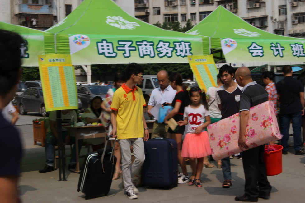 新生报到期间,学校各部门通力配合,全体新生班班主任及后勤保障人员、学生志愿者全天候忙碌在校园里,从报到咨询到注册登记,从物品领取到入住宿舍,整个现场秩序井然。为使新生顺利完成报到注册,个别班主任提前建立班级QQ群,印制微信平台二维码名片,直接通过扫描二维码就可以与家长建立互动平台。