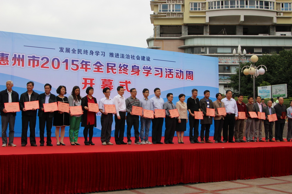 仪式上还为我市各县区的20名“百姓学习之星”颁发了荣誉证书。惠州电大党委书记、校长温金龙,副校长、党委副书记杨祖武参加了开幕式有关活动。《惠州电大教育》、《惠州实践—培养村官大学生工程、社区干部素质提升工程》等学校近年办学成果在启动仪式上进行展出,颇受市民欢迎。作为惠州市成人教育协会会长单位,我校还积极与市教育局沟通、紧密配合,参与活动周的策划组织、文件通知起草;主导了全市“百姓学习之星“的推荐、评选等工作,为推动我市终身教育发展发挥应有的作用。