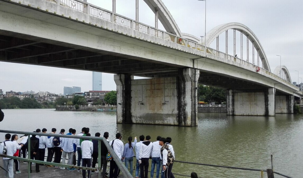 每到一处,学生们热情高涨,踊跃提问,随行的老师们详细讲解了桥梁设计建造的有关知识,逐一对桥梁的类别、桥梁的横跨、斜拉桥和拱桥的受力方式进行点评和讲解。西枝江桥、水门桥,让学生近距离地认识了桥台、桥面、桥墩等组成构造;合生大桥,让学生对斜拉桥的构造有了更直观的认识,同时被合生大桥的宏伟所震撼;西湖六桥,学生不仅感受到了拱桥的柔美、九曲桥的迂回以及偃龙桥的委婉,更是深深地被惠州古桥的文化气息所感染。