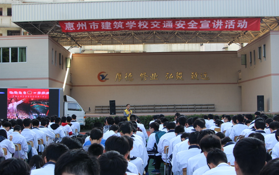 “我,一定要遵守交通规则!因为我的家人深深的爱着我,我也深深的爱着他们!我,从今天起,向生命承诺,一辈子做到遵守交通规则!我还会做一个文明的交通参与者……”12月14日,一场别开生面的“道德讲堂”在惠州市建筑学校文体中心开讲,马路天使交通安全志愿服务队创始人、中国职业交通安全演讲第一人 、我市第10位“中国好人”马相华为我校全体师生上了一堂生动的交通安全知识讲座,1300余名师生聆听了讲座。