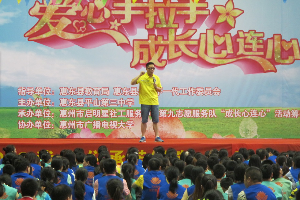 5月29日,由惠东县平山第三中学主办、惠州市启明星社工服务中心第九志愿服务队承办、惠州市广播电视大学协办的“爱心手拉手、成长心连心”大型公益活动在平山第三中学训练馆隆重举行。来自全国各地的义工,平山第三中学的学生、家长、老师380多人共同参与了体验式的学习活动。