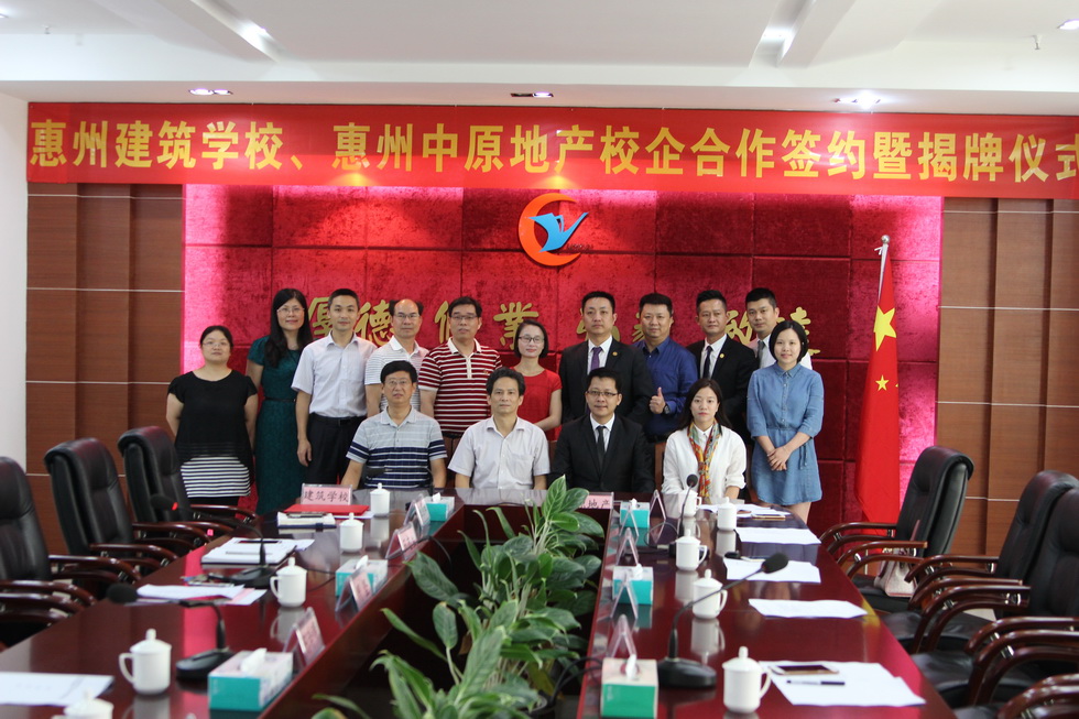 6月15日,惠州市建筑学校(市电大中职部)与惠州中原地产有限公司校企合作签约暨揭牌仪式在综合楼十一楼会议室举行。惠州电大副校长、建筑学校校长陈玲明,建筑学校副校长周坚,惠州中原地产有限公司董事、总经理钟志斌,高级人事经理刘金玲,学校和企业相关科室(部门)负责人参加了此次活动。