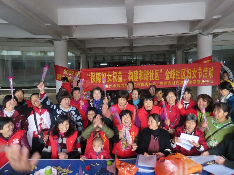 为提升妇女的自我保护意识,推动社区教育发展,3月8日上午,惠州市电大(市社区教育指导服务中心)联合金峰社区综合服务中心阳光社工、美好志愿者队,在名流印象小区开展“保障妇女权益,构建和谐社区”活动,社区妇女欢聚一堂,共同庆祝“三八”国际妇女节。 活动以茶话会的形式开展,名流业委会向在座的妇女同胞们表示节日的良好祝愿,阳光社工等工作人员则向居民发放反对家庭暴力的倡议书、反家暴的知识要点等宣传资料,了解收集居民在婚姻家庭生活中遇到的相关问题,以便活动后向专业的律师进行咨询,提供专业的维权建议或解决措施。活动现场,社区妇女个个踊跃参与,轮番展示音乐才艺,欢声笑语不断,洋溢着温馨和谐的气氛,向大家展现了新时期妇女同胞开朗、积极向上的生活态度,社区李阿姨拉着社工的手,还现场教社工打太极拳。 活动的开展,进一步提高了社区妇女的法律知识,引导居民从传统的委曲求全转向理性维权,必要时利用法律手段维护自己的合法权益,同时,丰富了辖区妇女的日常生活,从而增进邻里感情,促进家庭和谐,加强妇女姐妹之间的交流,增加她们的幸福感,让她们度过一个温馨快乐的节日。